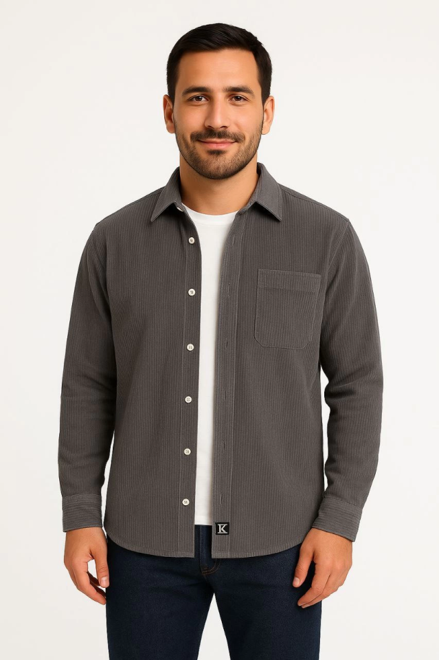 Erkek Fitilli Kadife Cepli Gömlek Oversize Rahat Kalıp - Füme