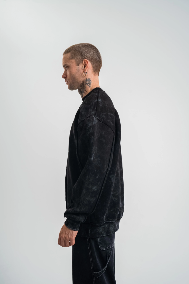 Unisex Bisiklet Yaka Özel Pis Dikişli Yıkamalı SweatShirt - Siyah